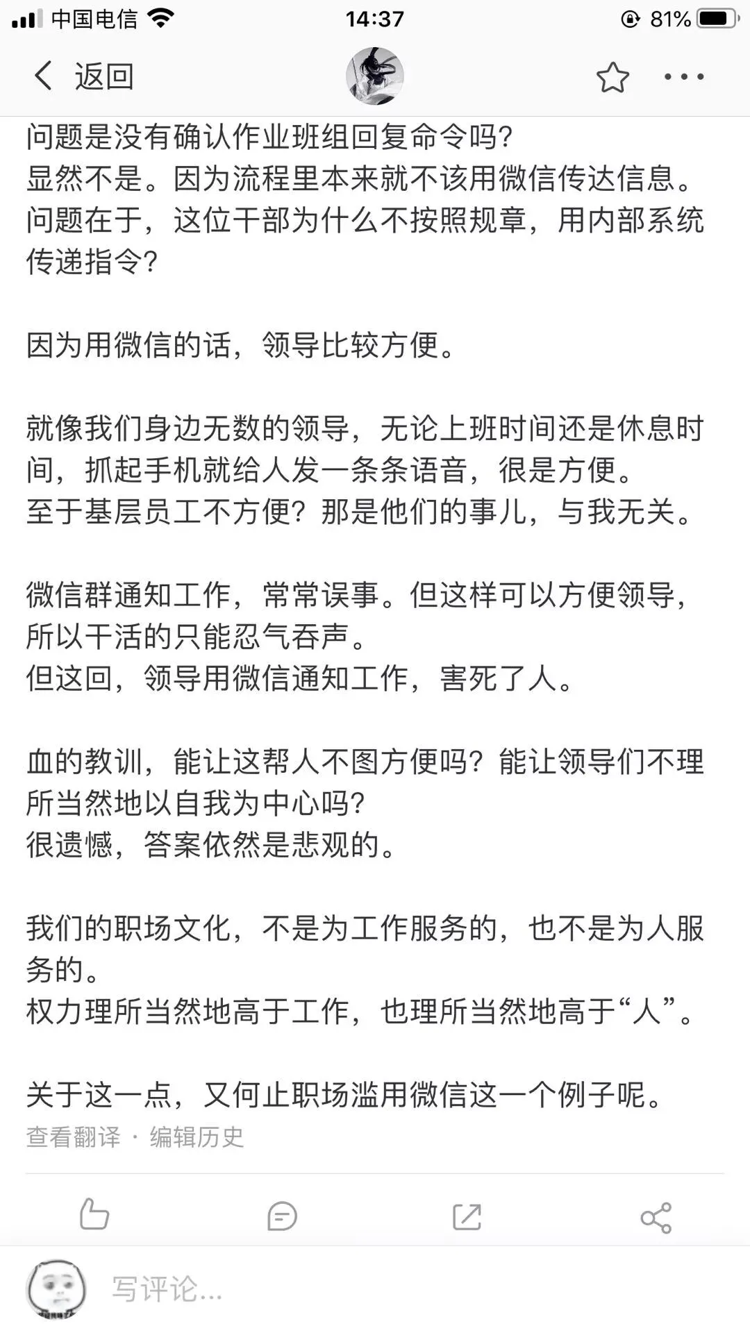 但如此重要的作业通知消息竟然是用微信层层传递的,只要其中任何一环出现漏传问题就有可能会造成安全事故。
