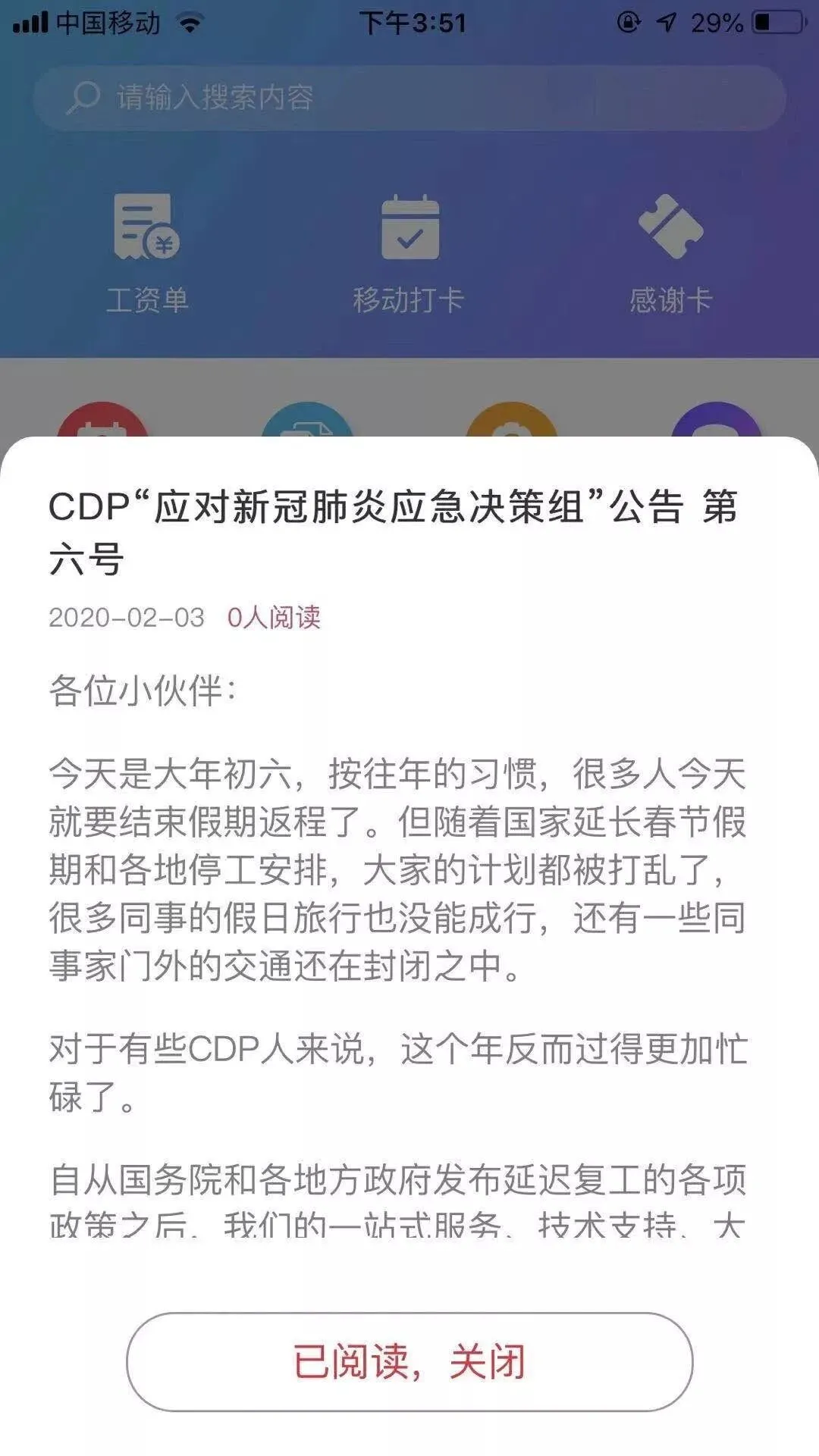 由于疫情的爆发,各地政策变动频繁,就会出现信息沟通不及时的情况,使得员工陷入混乱,而WorkLife的在线公告能将重要信息弹窗,让员工强制阅读而且HR可以在后台精准看到推送的已阅读情况。