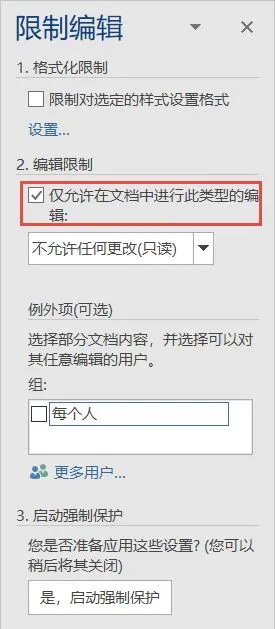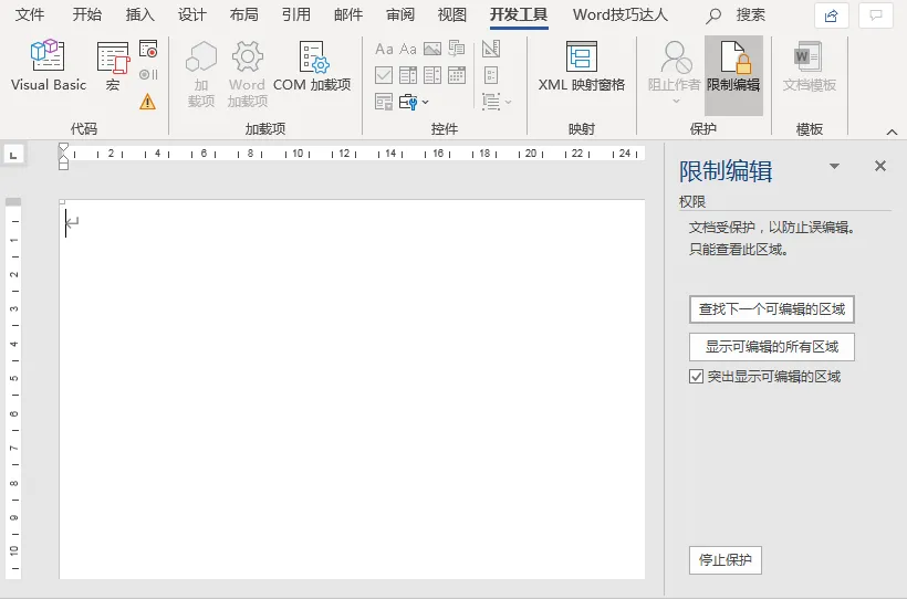 单击【开发工具】选项卡 – 【限制编辑】,会看到【限制编辑】窗格,在这里我们可以查找编辑的区域。