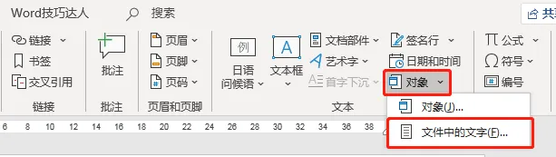 Strep 02 : 单击【插入】选项卡 – 【对象】- 【文件中的文字】,这样就能获取文件里边的内容了。