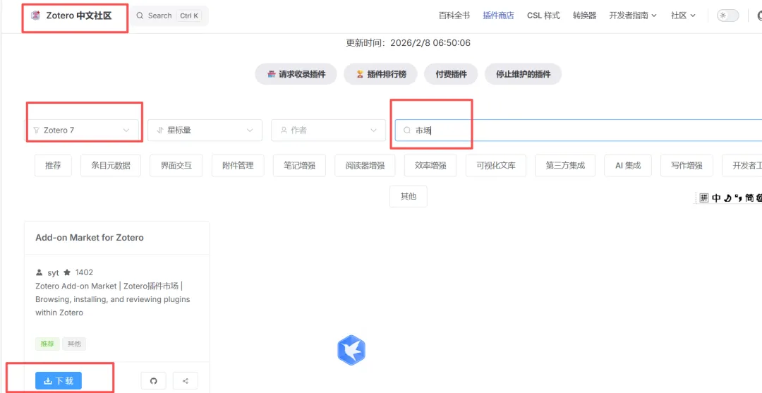 zotero插件市场插件下载:搜索zotero中文社区–插件–插件市场–选择“国内镜像”–搜索插件市场点击下载。