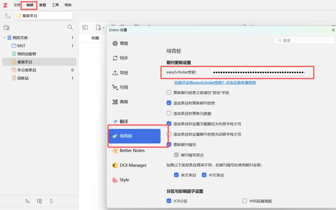 https://www.easyscholar.cc/#home(easyschoolar网址)–注册登录–右上角我的信息–开放接口–复制密钥–打开zotero软件–编辑–设置–绿青蛙–输入密钥即可。