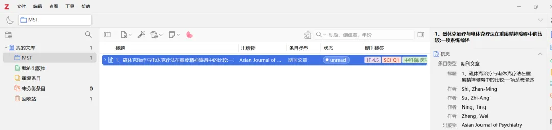 将下载好的pdf文献直接拉入,zotero即可自动抓取文献信息(IF和分区需要先下载绿青蛙插件才会有)