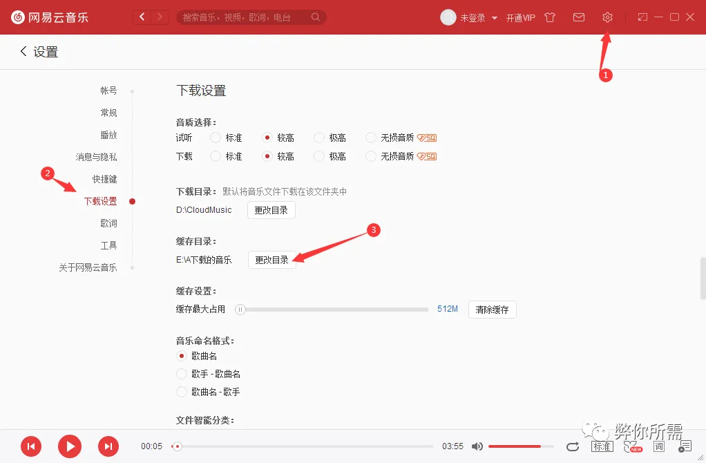 第一步:把刚刚安装的网*云音乐打开,点击:设置——下载设置——该缓存目录。这个需要注意的是记住自己设置的缓存目录路径,下面用的到。