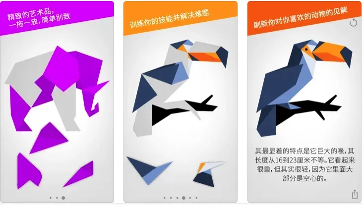 一款拼图游戏,玩法非常简单玩家只需将各种不同的形状组合成多彩的动物图像即可,设备需装有 iOS 7.0 或更高版本。