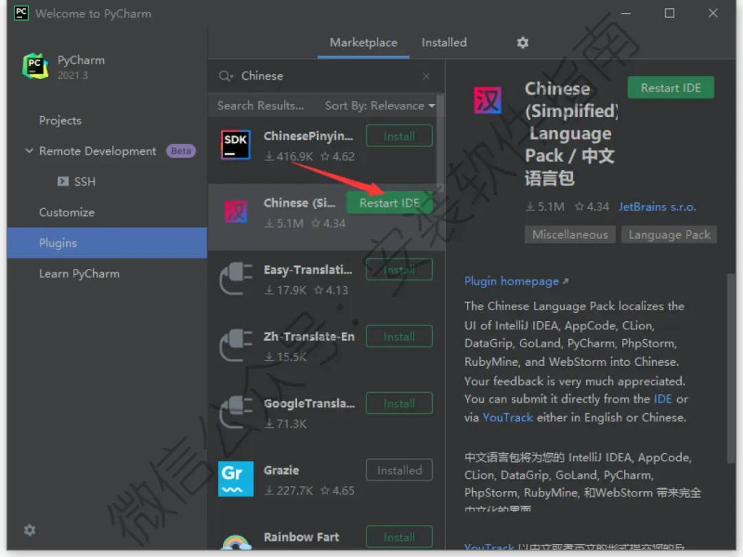 24、在上方搜索框中输入chinese,在出现的插件中,选择Chinese(Simplified)langua…简体中文语言插件,点击Install安装