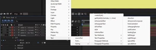 “表达式语言”弹出菜单列出了 After Effects Beta 版中包含的所有段落属性。