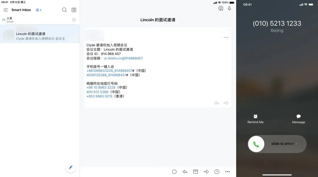 最后一点原因则来自少数派设计团队的招聘需要:因为岗位特殊,即便无需求职者专门注册会议账号,招聘设计师的过程中双方进行屏幕共享、就设计作品交换想法也必不可少。通过飞书招聘的线上会议,应聘者可以直接通过飞书招聘在线流通,省去了跳转、选择第三方工具的麻烦。