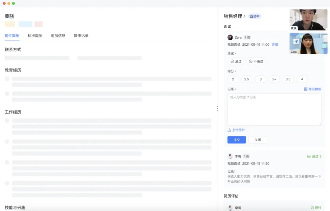 当然了,入职以后在和同事聊天过程中我也了解到了飞书招聘系统的更多细节,比如直接使用飞书会议不一样的是,飞书招聘在面试过程中还提供了「面试空间」功能,面试时面试官可以借助这个功能一边和候选人聊天沟通,一边查阅简历、撰写面试记录及相关评价。