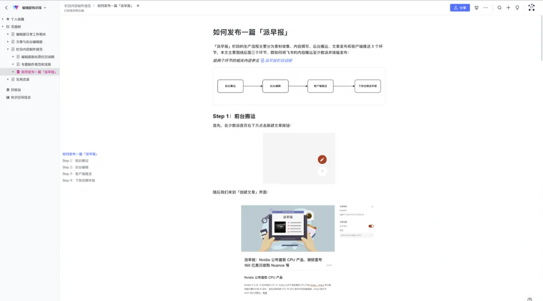 因此知识库功能在飞书中的整合可以说是众望所归了。面试前编辑部已经在第一时间迁移了大部分外部内容到飞书知识库中,所以我在入职后得以通过同事分享的知识库链接快速了解到相关的工作项目和工作任务。