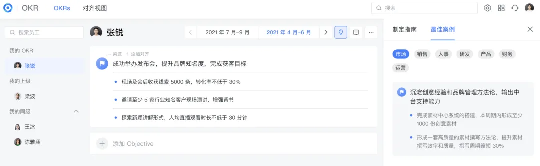 还记得前面提到的各部门因为不同部门目标导致的各种问题吗?使用飞书 OKR 以后不仅可以可以明确目标,现在还可以快速了解每个人分别在努力什么了,也就是常常提到的对齐。