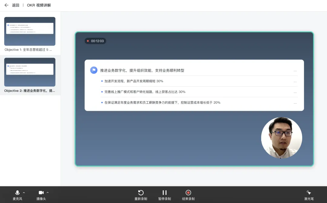 主管有时还会通过录制 OKR 视频帮助我更好地理解他的关键结果和其他部门的关键结果,让我能更好地进行对齐和制定的 OKR。