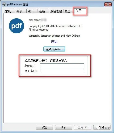 [右击]pdfFctory,选择[打印机属性],切换到[关于]页面进行注册,至此完成完装