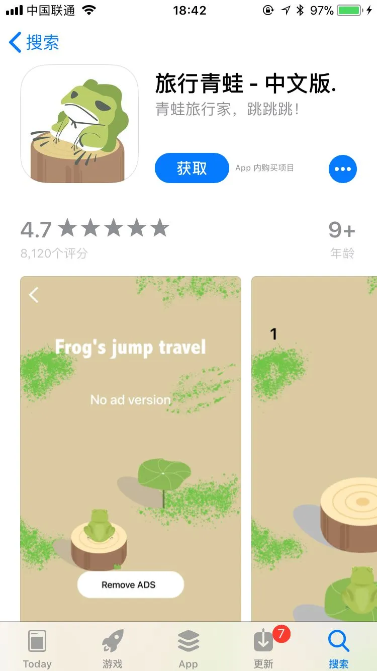 【 旅行青蛙 – 中文版. 】,排在第一,8120 个评分,平均 4.7 分,没毛病,应该就是他了!!