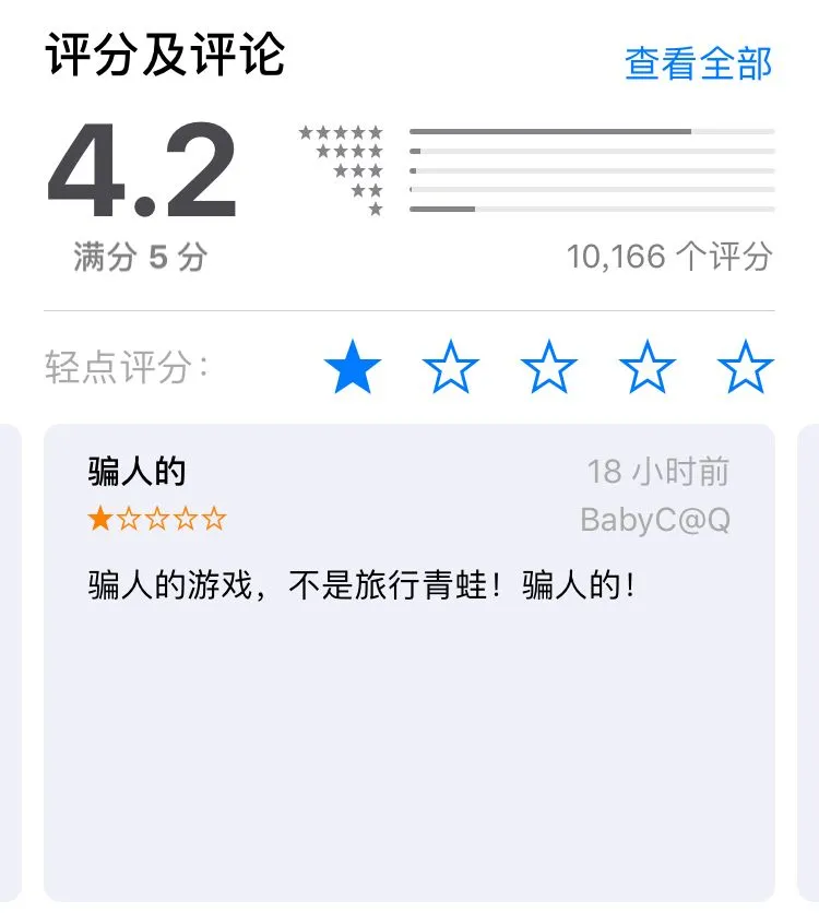 然而尴尬的是,因为这个游戏只有日版,名称也是日文的【 旅かえる 】 ,很多新玩家不明觉厉,直接去 App Store 搜索 【 旅行青蛙 】 。