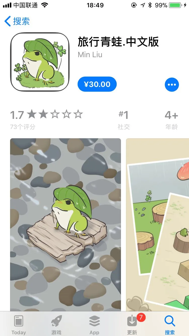 这个山寨的【 旅行青蛙 】还好,毕竟下载不收费,去广告也只要 6 块钱,你再往下看看,居然还有一个 【 旅行青蛙.中文版 】,也是青蛙跳一跳,下载就要收费 30。。