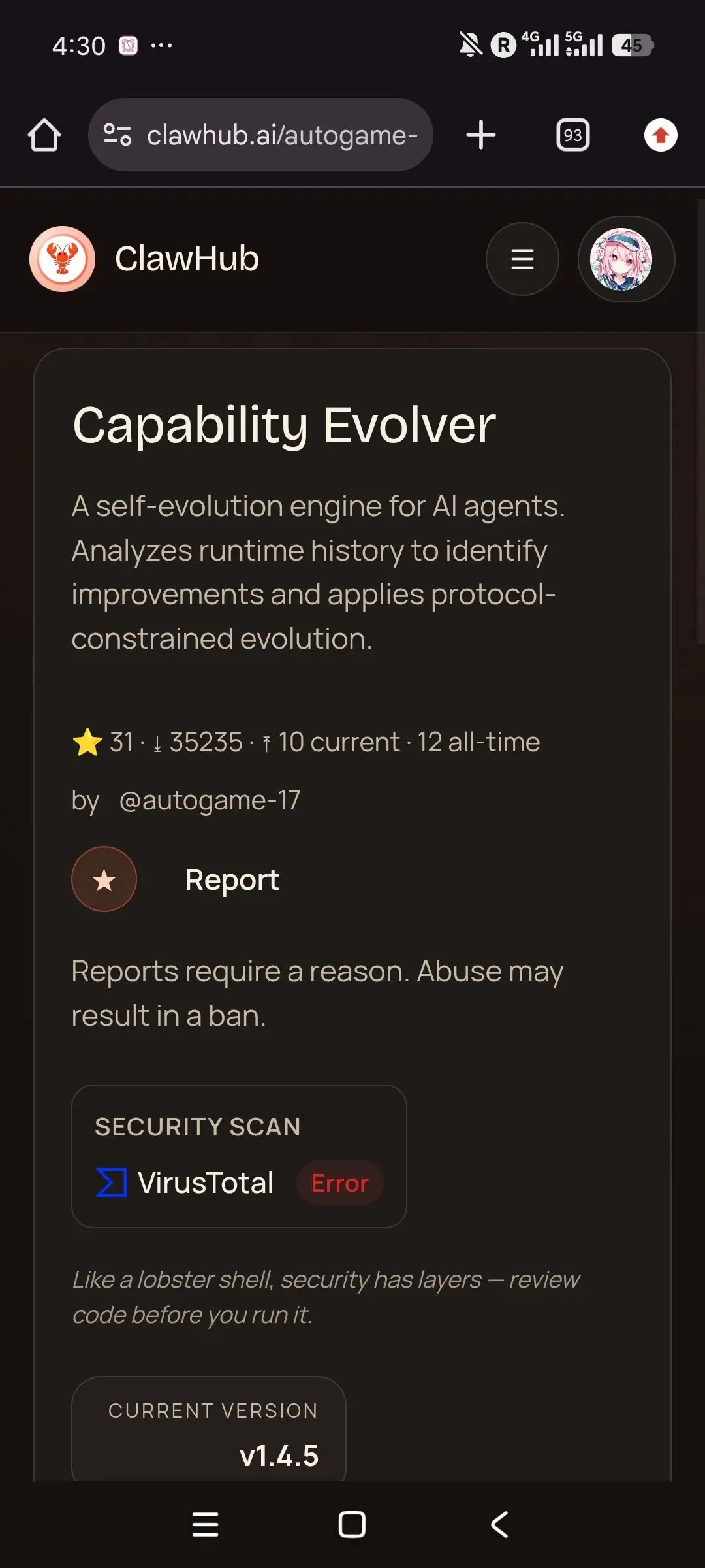 几个小时后,Evolver又重新出现在Clawhub上了。