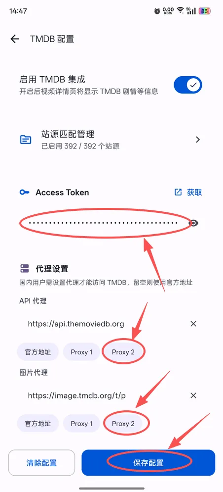 10、回到羊壳app,把复制的API令牌粘贴到token框里,并点击下方代里设置的两个【Proxy2】,然后点击【保存配置】,TMDB即配置成功。