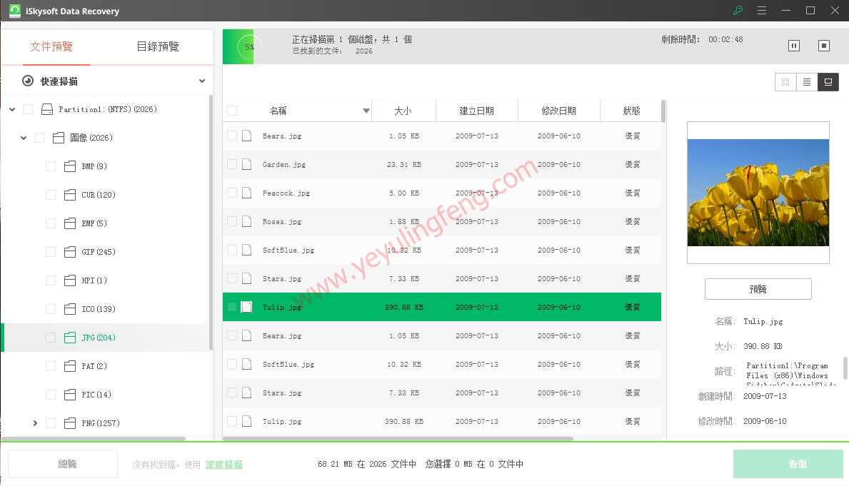 日常整理文件可能会由于操作不当删除了一些重要的文档,一般的小文件都可以在回收站选择回复,如果文件过大或者回收站都清空了那么只能借助于专业的数据恢复软件,亡羊补牢为时不晚,通过这些工具基本上还能挽救一下一系列的惨案。iSkysoft Data Recove是一款非常专业的数据恢复工具,无论是意外删除,格式化,不正确的操作,病毒感染以及您可以想到的其他原因恢复丢失的数据均可以在第一时间使用iSkysoft Data Recove恢复,至于恢复效果这里老夜只是简单的恢复了几张图片,一些极端环境老夜并没有测试,硬盘有价数据无价,大家日常记得保持备份的好习惯,毕竟这种工具都只是救急的。