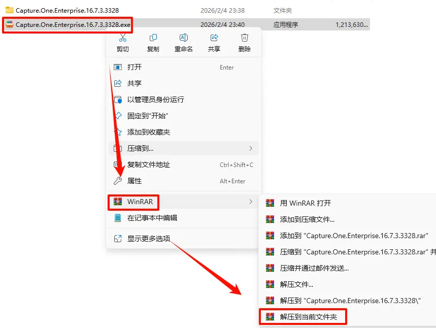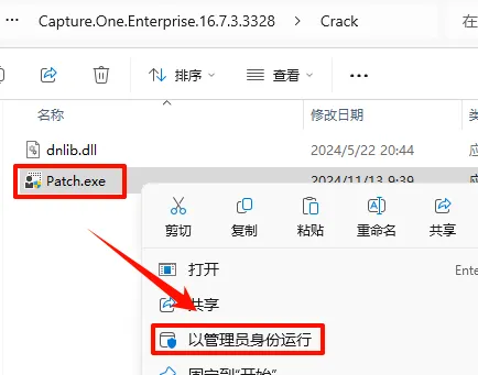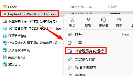 2.打开刚刚解压的文件夹,鼠标右键点击“CaptureOne.Win.16.7.3.3328.exe”选择“以管理员身份运行”