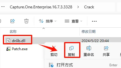 9.返回解压的“Capture.One.Enterprise_16.7.3.3328”文件夹,双击打开“Crack”文件夹,选中“dnlib.dll”文件,鼠标右键点击“复制”