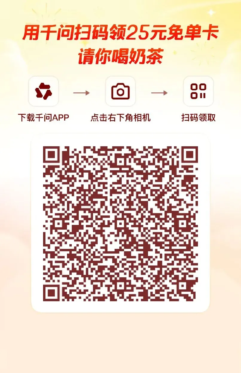 所有用户先更新千问App到最新版,打开后都能白拿一张25元无门槛免单卡,不仅能免单喝奶茶,也能通过淘宝闪购买年货、点外卖。