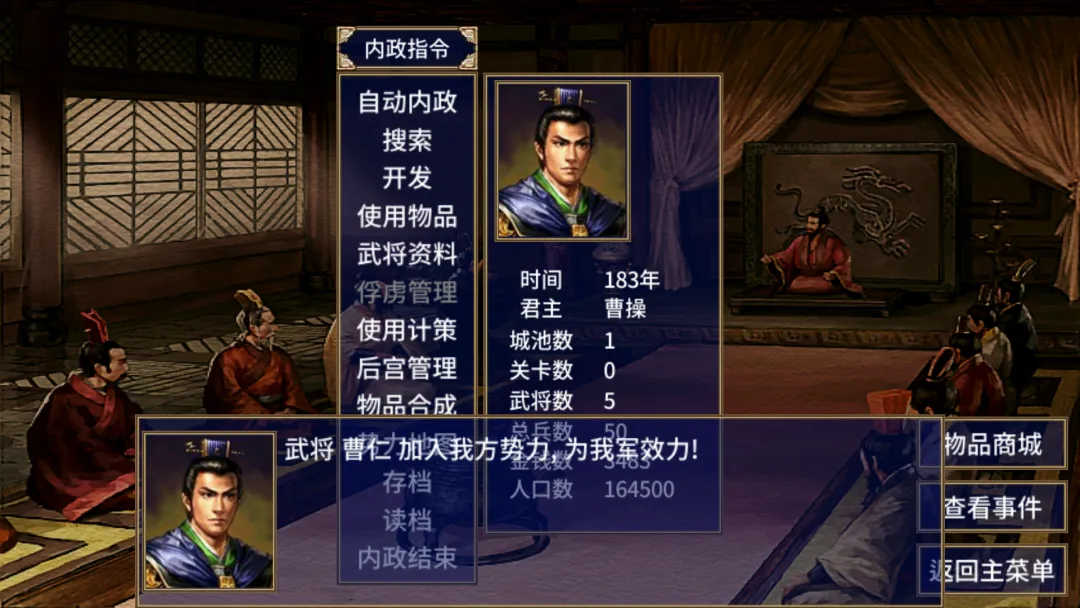 :派遣武将寻访隐士(华佗、左慈),或于酒馆招募浪人,需权衡“魅力”属性与城池声望; - 经济命脉