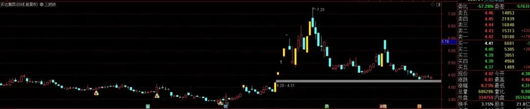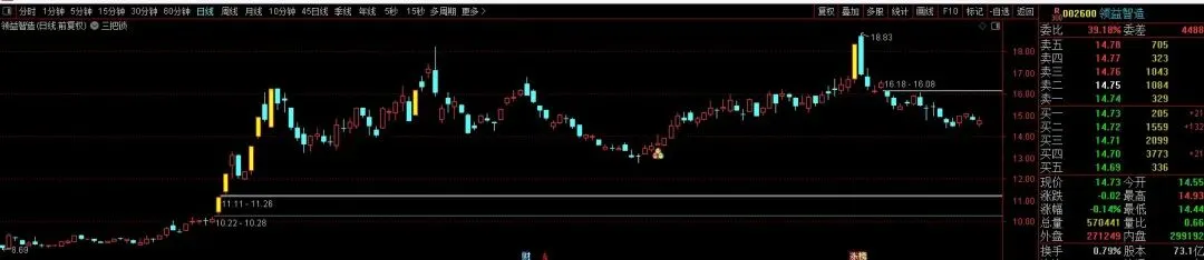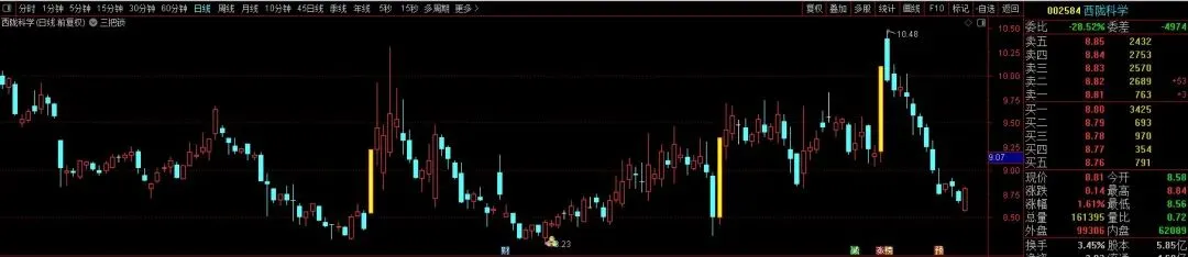 STICKLINE((C – REF(C, 1)) / REF(C, 1) * 100 > 9.5, C, O, 1.5, 0), COLOR00FFFF;动量差:= (EMA(C, 8) – EMA(C, 55)) * 10;