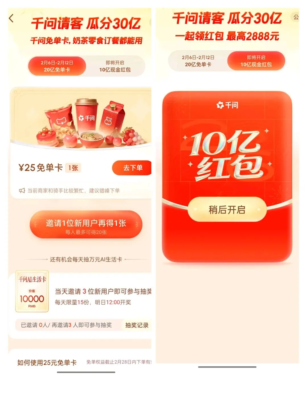 2月6日0点,阿里巴巴旗下千问App落地开启“请你喝奶茶,每天只要1分钱”活动,并且后续还有“一起领红包,最高2888元”。