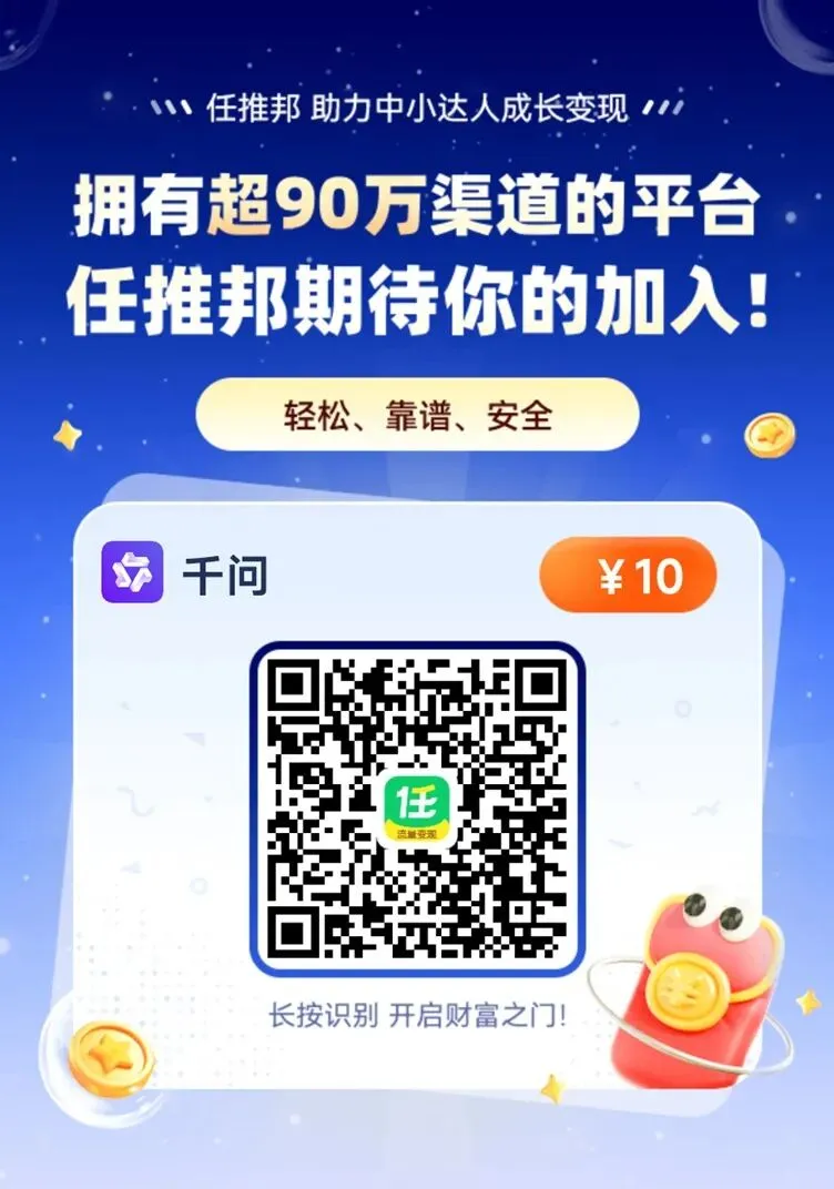 据内部消息,千问拉新政策将于3月调整,基础佣金或下调至8元/单。此刻入局,既能享受空白市场的流量红利,又能锁定当前高佣政策。扫码进入任推邦千人群,获取“爆款文案库+实时数据看板”,让每一份努力都转化为真金白银!