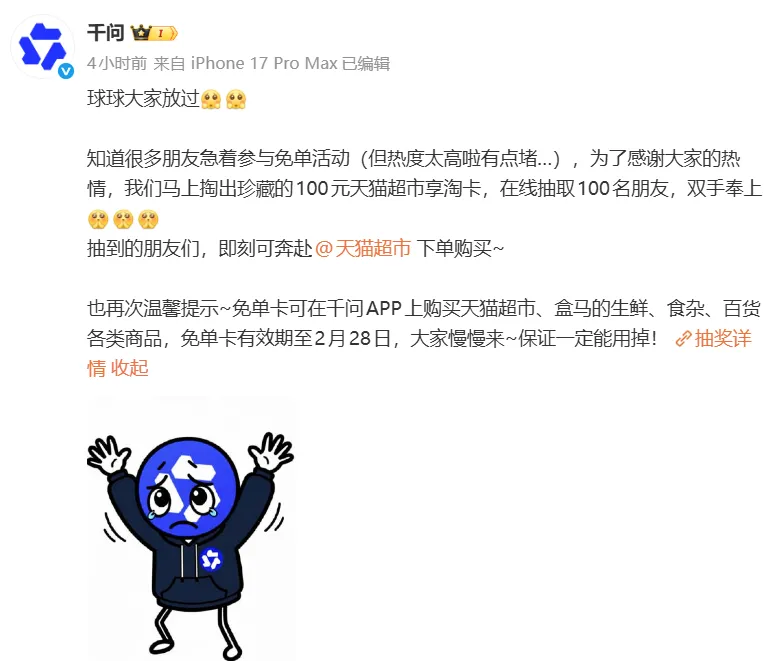 千问APP崩了,官方发文“求放过” 2月8日,有用户反映千问APP崩了。 千问发文称“球球大家放过”,知道很多朋友急着参与免单活动,但热度太高有点堵。千问再次提醒免单卡有效期至2月28日,大家慢慢来,保证一定能用掉! 编辑丨张煦 来源丨@千问