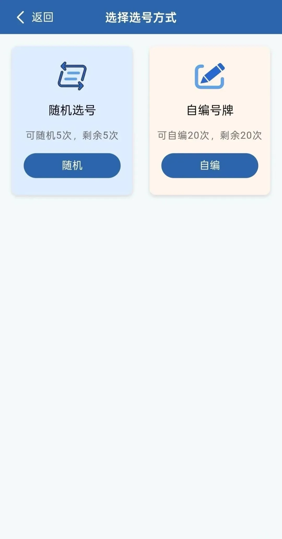 随机次数用完后,超过规定时间未确认号牌号码的,将自动确认第一个号码。随机选号一旦成功,将无法再进行自编选号。