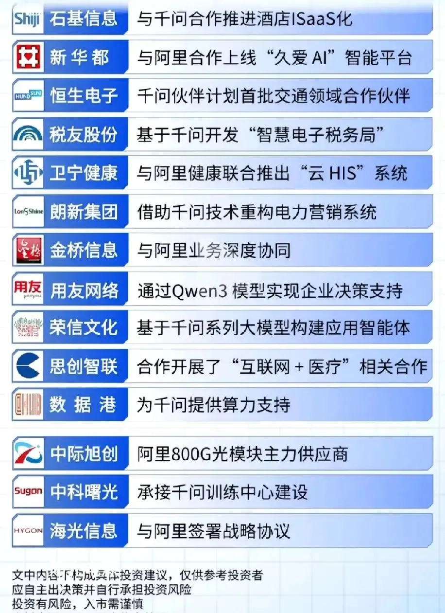 数据港是国内领先的互联网数据中心服务商,也是阿里云的核心合作伙伴,为阿里千问提供算力支持。石基信息是国内领先的酒店、餐饮等旅游信息化服务商,公司与阿里千问的合作方向是推进酒店ISaaS化。