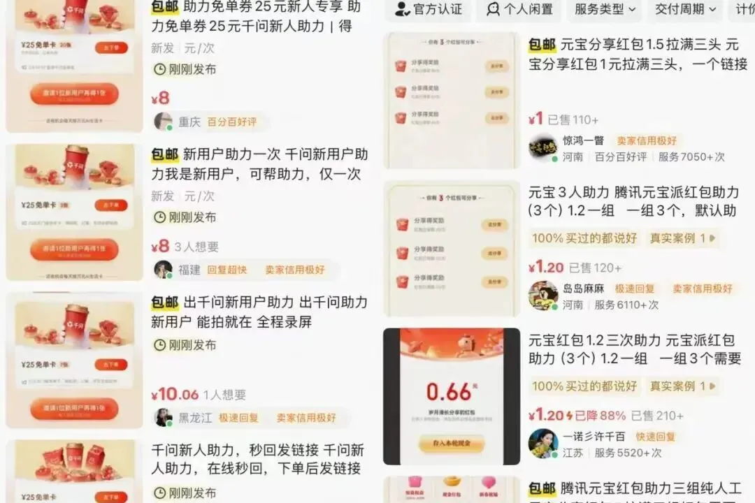 2月8日,记者发现,闲鱼平台新上架了不少“千问助力”“元宝红包助力”等相关链接,“AI新人”正被批量出售。