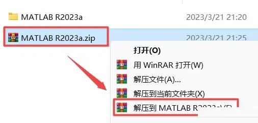 1.鼠标右键单击Matlab 2023a压缩包解压到当前文件夹,解压完成后,打开解压出来的文件夹;