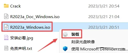 2、打开刚刚解压的文件夹,然后找到matlab2023a文件夹,找到并选中“R2023a_Windows.iso”文件,鼠标右键选择“装载”(如果没有“装载”选项的可以右键选择“打开方式—Windows资源管理器”打开)