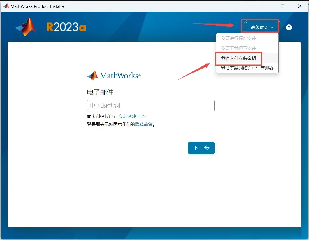 4、点右上角高级选项,然后点我有文件安装密钥