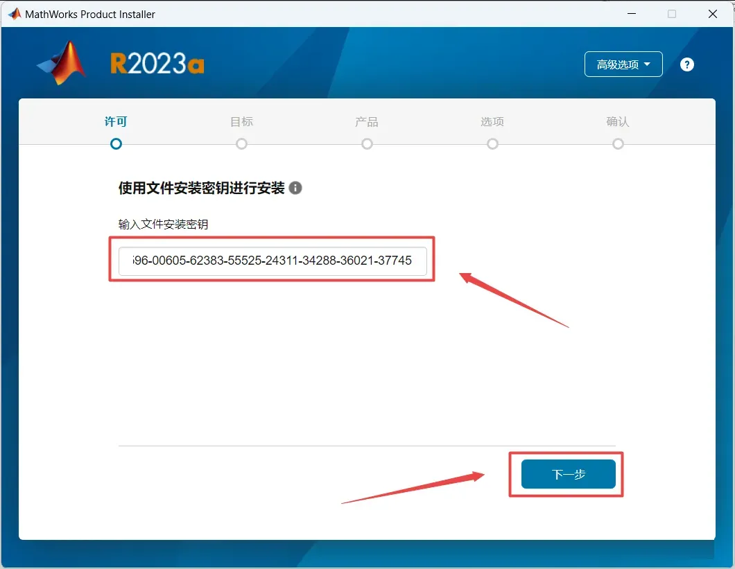 6、在输入文件安装密钥输入框中输入:“17704-65516-28949-05196-27677-58153-52675-25427-40932-65107-12325-01750-10518-09536-46547-49184-48288-09956-47596-00605-62383-55525-24311-34288-36021-37745”,点击“下一步”