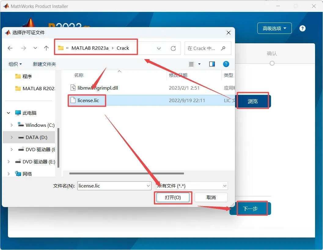 7、点击“浏览”,找到解压后的“MATLAB R2023a”文件夹路径,打开“Crack”文件夹,选中“license.lic”文件,点击“打开”,点击“下一步”(路径不要有中文)
