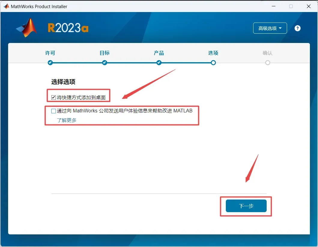 10、勾选“将快捷方式添加到桌面”,取消勾选“通过向MathWorks公司…”,点击“下一步”
