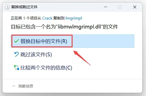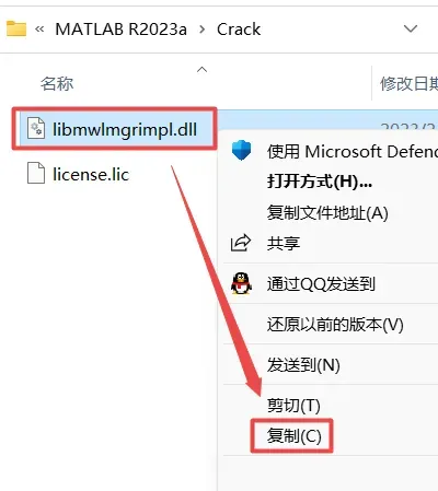 14、打开之前解压的“MATLAB R2023a”文件夹,双击打开“Crack”文件夹,鼠标右键点击“libmwlmgrimpl.dll“选择“复制“