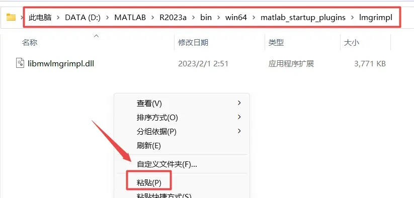 15、依次打开软件安装路径“D:\MATLAB\R2023a\bin\win64\matlab_startup_plugins\lmgrimpl”(参看第8步),在打开的文件夹空白处,鼠标右键“粘贴”刚才复制的“libmwlmgrimpl.dll“文件