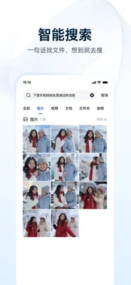 此外,夸克网盘App还支持智能相册与智能搜索,通过一句话即可快速定位照片,图片中的文字、文档内容也能直接搜索,大幅提升查找效率。