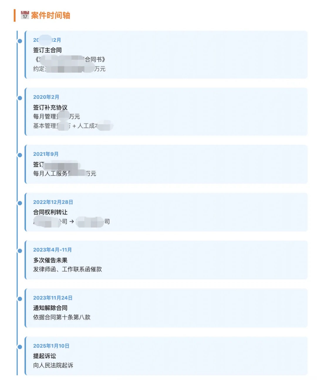 客户拿到一份案件时间轴,2019年签约→2020年补充协议→2021年违约→2023年诉讼,关键节点一目了然,比看文字描述节省80%时间。