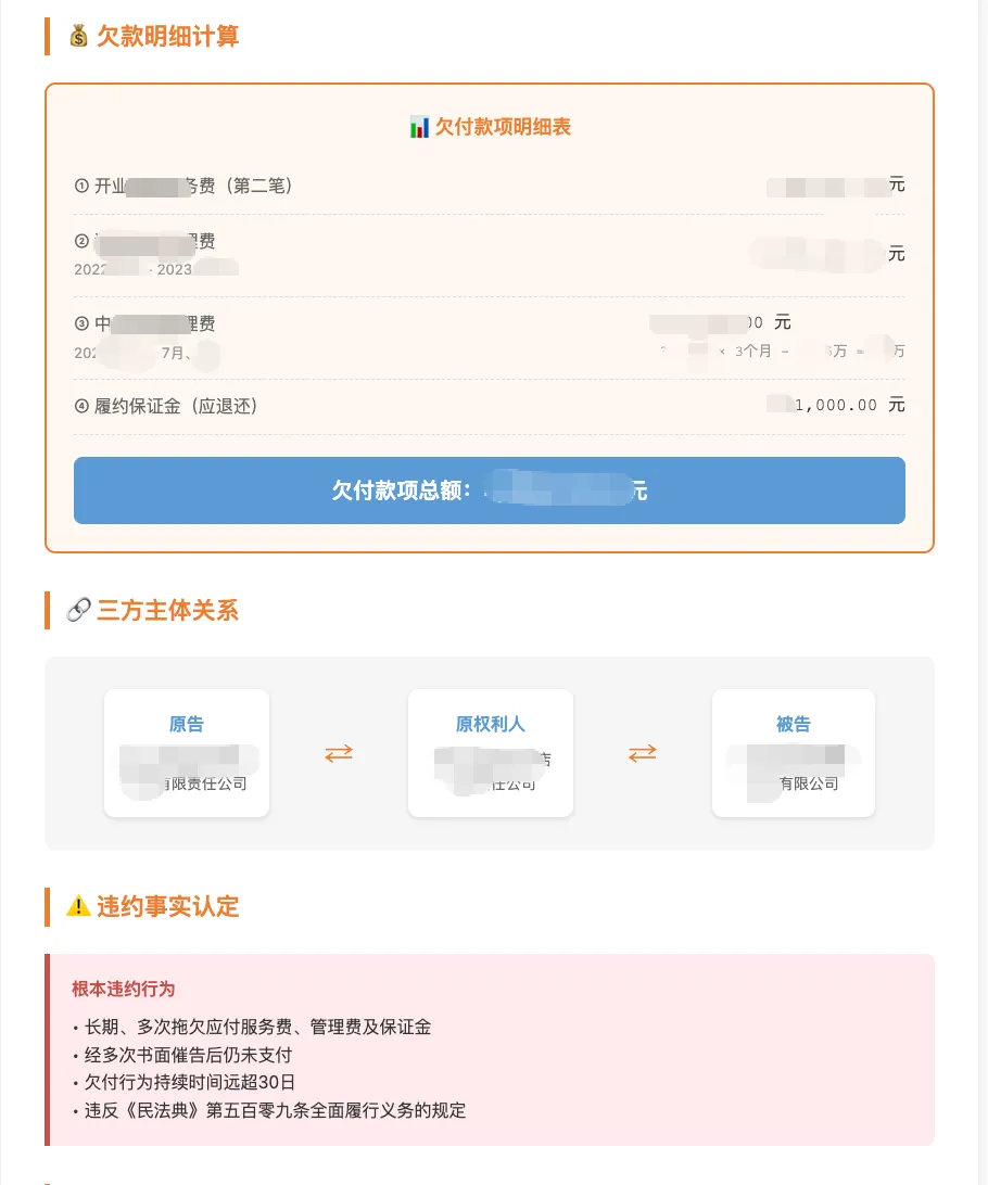 用户:对这个文件夹使用文档可视化转换Claude code 或者 OpenCode:📁 找到1个文档:民事起诉状.PDF 检测类型:法律文书 建议方案: - 案件时间轴(横向展示2019-2025关键节点) - 欠款明细计算表(4笔款项分项展示) - 三方主体关系图 - 请求判决的结果摘要(3大判项) 页面尺寸:A4纵向,预计3页 以上方案您是否确认?用户:确认Claude code 或者 OpenCode:✅ 已生成可视化文档 - 民事起诉状核心意见_可视化.html(13KB) - 民事起诉状核心意见_可视化.pdf(92KB)