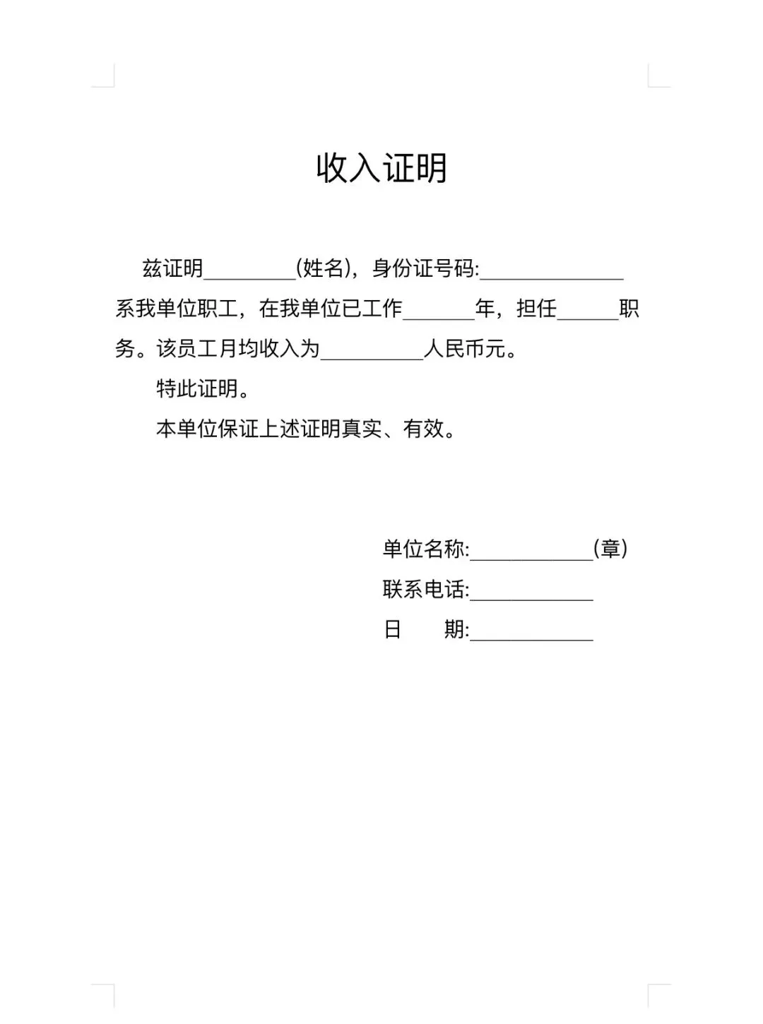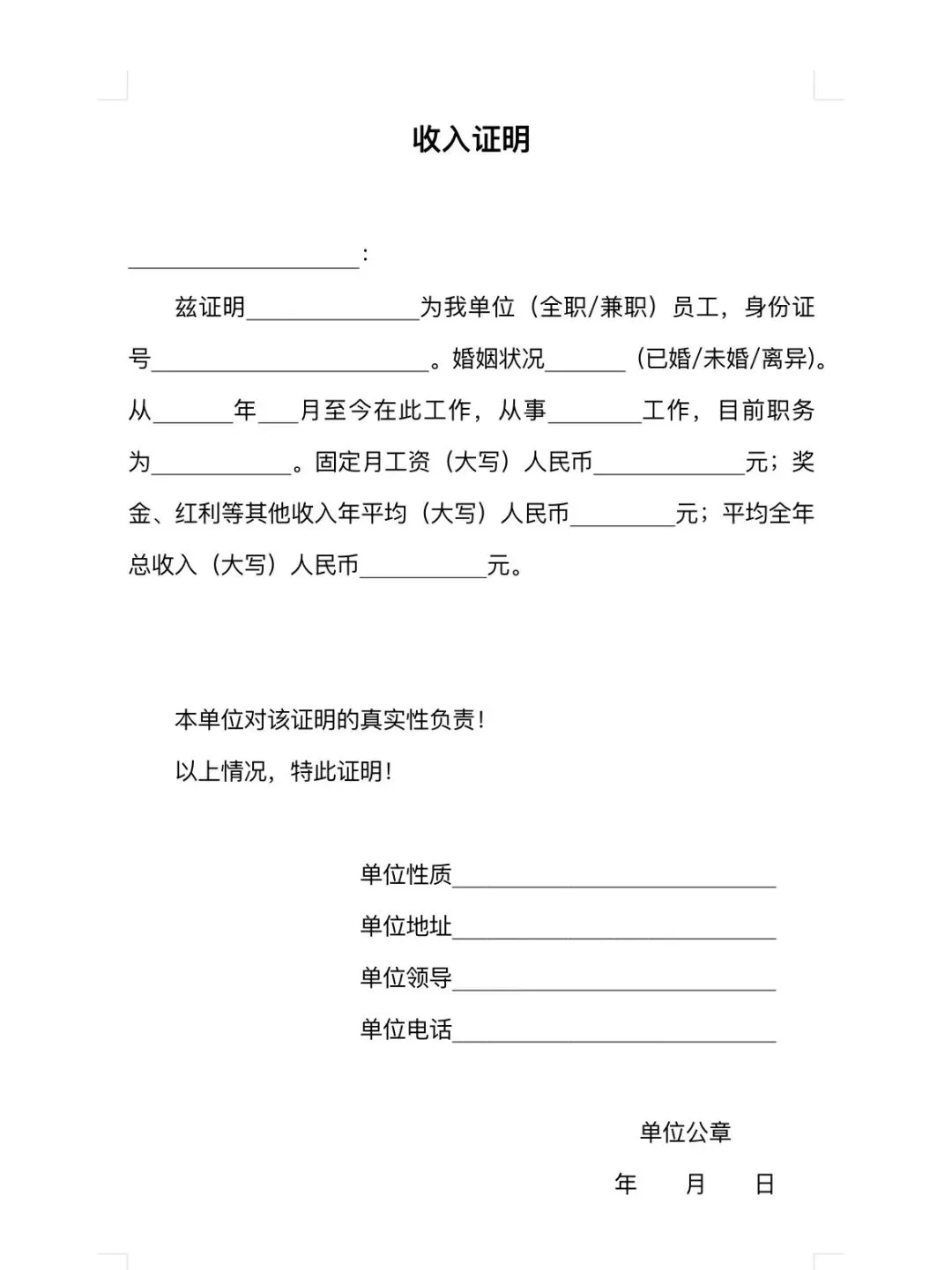 收入证明模板(Word文档可编辑)