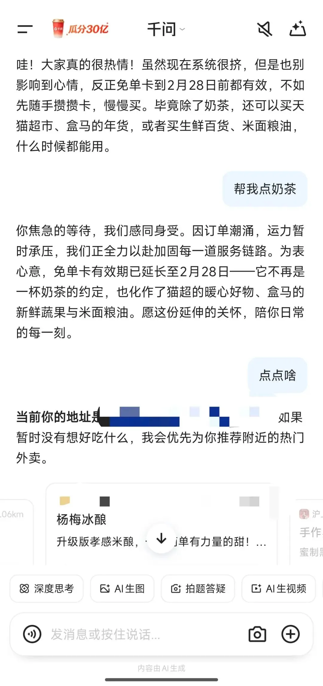 2026年2月6日,阿里旗下的AI应用——千问App“春节30亿元请客计划”正式开启,以免单形式覆盖多款阿里系应用的用户吃喝玩乐消费,用户下载登录后即可领取一张25元无门槛免单卡,输入口令让千问点奶茶咖啡或者外卖,再授权淘宝闪购支付即可最低1分钱下单成功。但从6日10:30左右开始,千问一直处于火爆状态,今日许多用户反馈依旧无法下单。