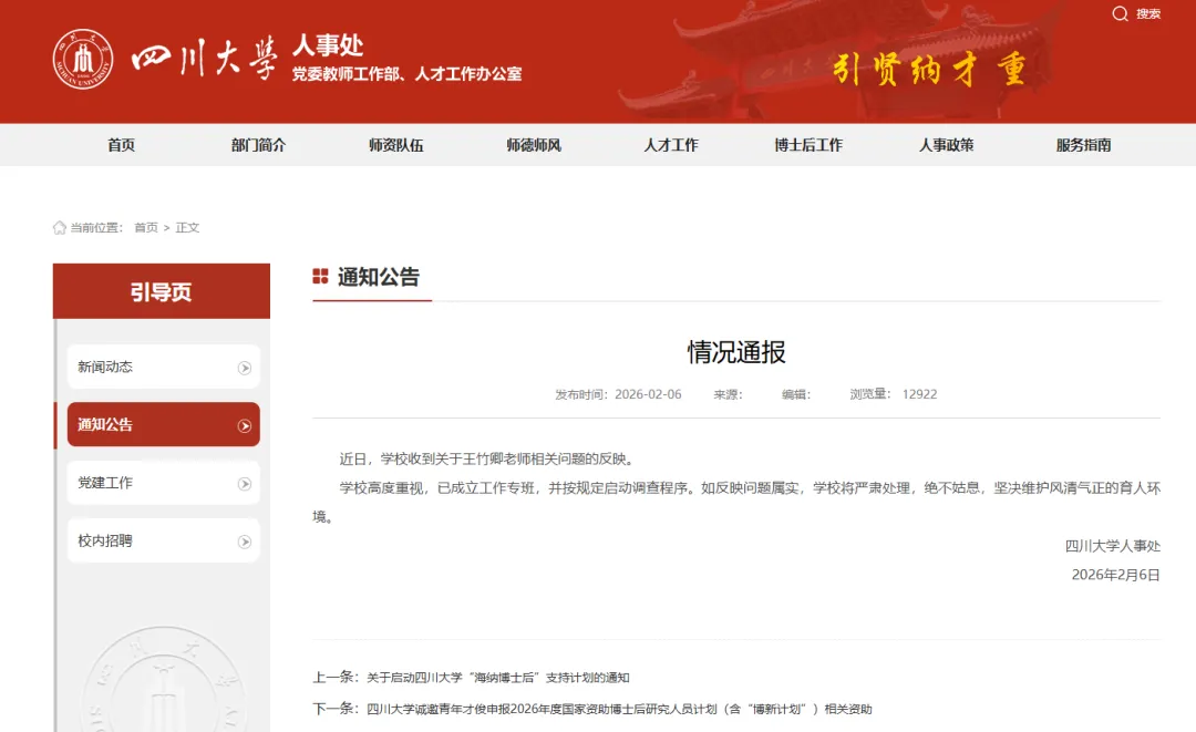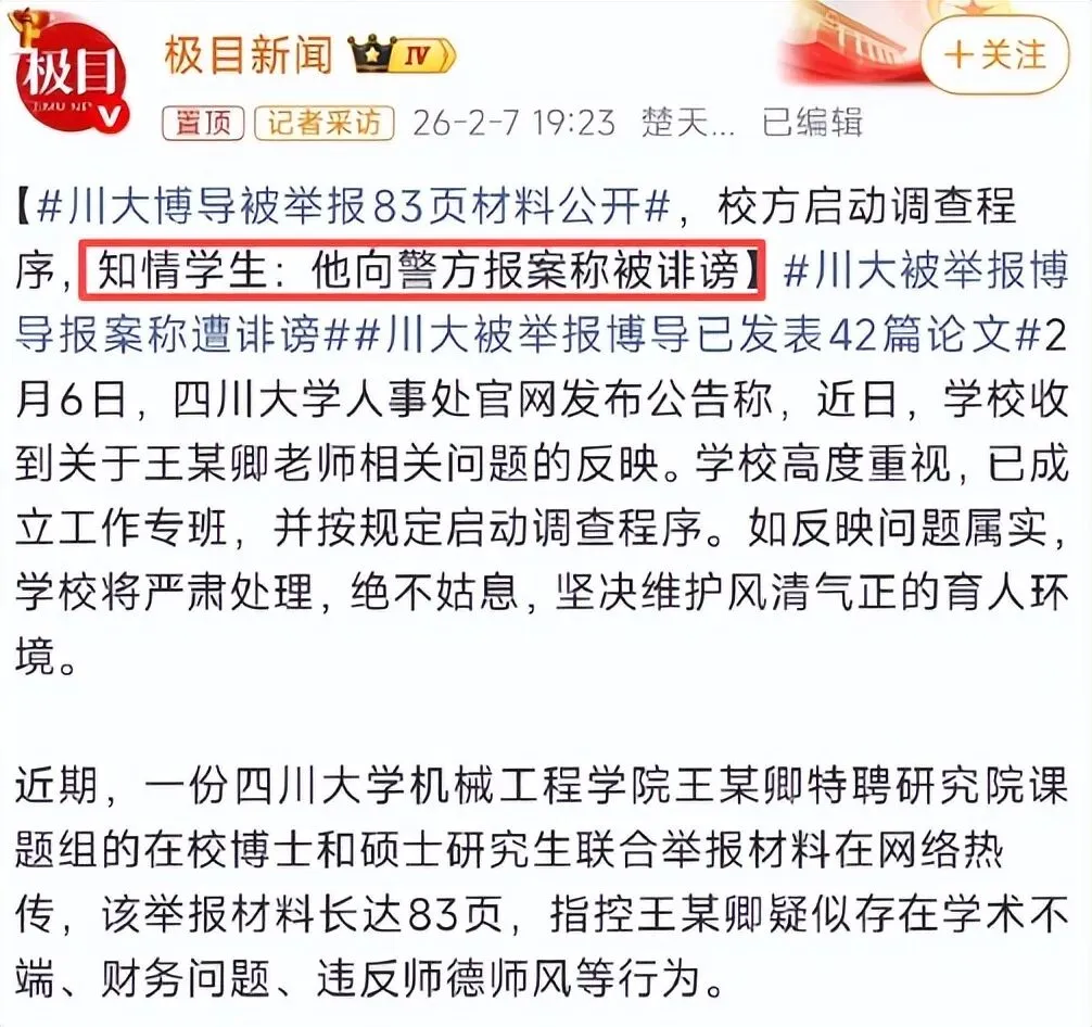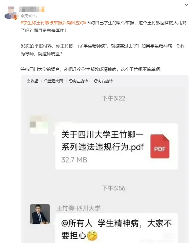 四川大学王竹卿被名下硕博生集体举报后,在学校发通报彻查后,让热议的声音小了一点,但是影响还在继续。