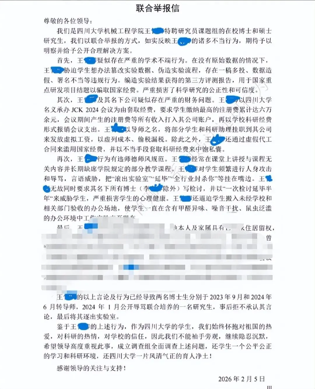 从举报材料目录看,王博导主要存在学术造假、项目财务管理混乱、打压学生、威胁博士延毕、还在某些场合说过不当言论得等行为。