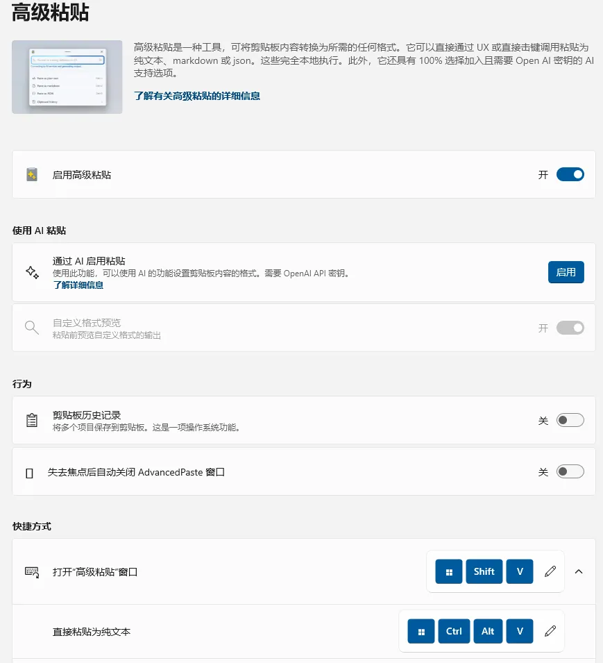 高级粘贴允许启用AI粘贴、查看剪贴板历史记录,或将文本内容粘贴为特定格式。